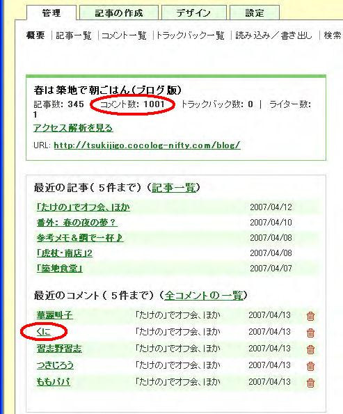 つきじろうさんのブログ「春は築地で朝ごはん」に書き込んだ僕のコメントが、1,000コメントだったということで、「ラーメンおごりましょうか?」というメールがきました。迷わず「関内の汁なしでお願いします」と返信。今回は1,001コメントをした「ゴージャスカレー姉妹」華麗叫子さんと、先日関内の行列の長さにヤラれた「食い道をゆく」ヒロキエさんの3人まとめておごってもらいました。セレブな美女、華麗叫子さんを二郎にお連れするとは、つきじろうさんなかなかやりますね☆1,000コメントはこんな感じでした。