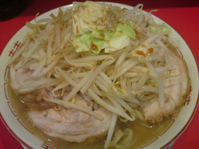 写真はらーめん全増し。野菜増しについては、店内に写真で盛りの例が示されている。それによると、大盛よりも増しの方がかなり量が多い。間違えられては困るので、「野菜は大盛で、あと、カラメ・ニンニク・アブラ」と注文。「ということは、全増しでよろしいですか?」と確認されたが、めんどうなので「はい」と答えた。結局出てきたのは、大盛相当のボリューム。店員さんは、そのまま券売機まで行って「野菜増し終了」の貼り紙を貼った。結局どちらでも変わらなかったらしい。