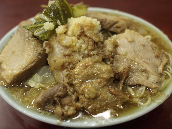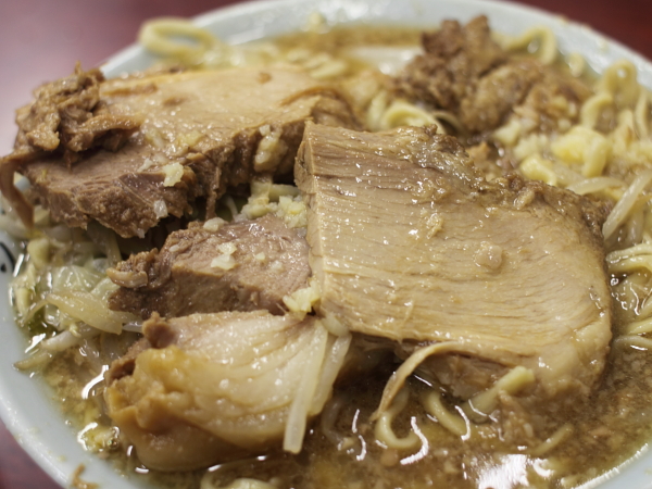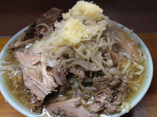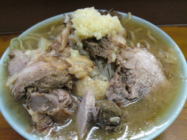 今回はブタメンではなく、普通のラーメンにしてみた。ブタのボリュームがかなりあるので、総量はかなり減ったはずだ。トッピングはニンニク・アブラ。別皿のアブラを入れるまでもなく、既にアブラがどっさりと掛かっている。スープは決壊しそうなほどヒタヒタの状態。相変わらずスープも麺もうまい。ブタも非常にうまいが、少ないので物足りない。やはりブタ増しでないとだめか。