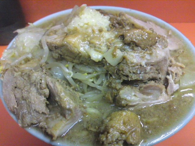 野菜マシにすると、見た目のボリュームが増える。なぜ「見た目のボリューム」と言うかというと、野菜が増えても大して腹にたまらないからだ。でも見た目はすごく大盛りに見える。野菜なんかマシマシでも大したことない。ブタは結構、腹にくる。今までブタ増しばかり食べてきたが、時々ブタをやめると全体のボリュームがかなり減ったことに気づく。麺マシはかなりキツイ。麺の量は写真を見ても分かりづらいが、増やすと一番腹にくる。野菜マシマシは、二郎では注文してる人をよく見る。三田本店や神保町のように、モヤシと細切りのキャベツが、カエシとアブラに絡まって、ものすごくうまくなっていることもある。でも大抵の店では、ただの茹でたモヤシだ。モヤシばかり食べても、そんなにうまいもんじゃない。やはり二郎はバランスが大事。野菜マシは見た目のボリュームと征服感がいいのだろう。二郎初心者にとっては、二郎食べた感が一番あるのかもしれない。二郎の魅力は野菜マシだけではないのに、一般に認知されているのはそんなとこだろう。写真はブタメンの全増し。富士丸の野菜は味が付いていてなかなかいい。でも増さなくてもいいかなという感じ。