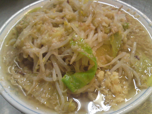 大盛り、カラメ、アブラ、ニンニクW。店員は、人のいい感じのおじさん。野菜増しのつもりはないんだけど、この店員さんの場合、大盛にすると野菜も大盛になる。でも味はいつも安定してうまい。今度から「野菜少なめ」にしよう。